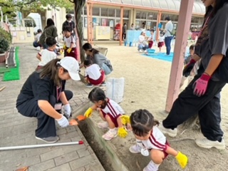 側溝にたまった土を掘り出したり、畑の雑草を抜いたりと、力仕事がたくさんありましたが、子どもとおうちの方のパワーのおかげで、園庭がすっきりと片付きました!!