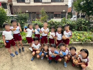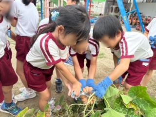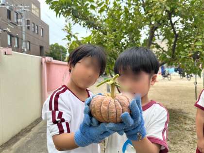 「重いな〜!」「このかぼちゃめっちゃ大きいで!」「何個あるかな〜?1.2.3...」とみんなで数え始めました!すると10個も収穫することができ子どもたちは大喜び!