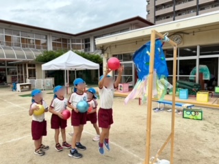 ボールを使って手作りのゴールにシュートをしたり、いろいろな遊び方を考えたりしてボール遊びが好きな子どもたち!