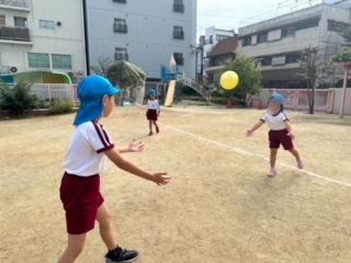 始めは5回も続かなかったですが何回も挑戦するごとに、友達が取りやすいように投げたり、投げる高さや速度を考えたり友達の名前を呼んでから投げたりと子どもたちなりに作戦を考えどんどん回数が増えていき、14回続くことができていました!「次は20回目指そう!」とやる気いっぱいでした!