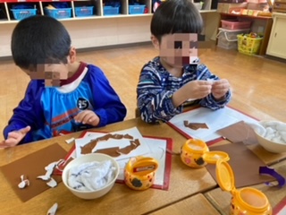 折り紙を自分で選んで、手先を使ってちぎり、のりで貼って楽しみました!