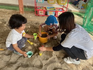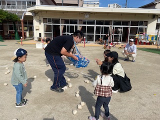 あか組(4歳児)の子どもたちと、追いかけ玉入れの勝負!ひよこクラブのお友達もたくさん玉が入りましたね☆