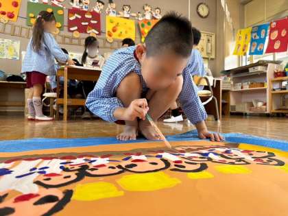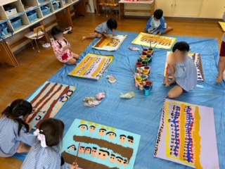 「僕の絵は、♪おいもごろごろの歌を歌って手をぐるぐる回しているところ!口は『お』の口してるねん!」「キラキラの舞台をかいてみた!」「お友達いっぱいかいた!」など子どもたちにとって思い出深い貴重な経験となったようです!