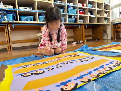 5歳児は、3.4歳児の倍の大きさの画用紙に絵をかいています!細部にもこだわりながらかいていることもあり、1枚の絵に何日も時間をかけてかいています!