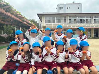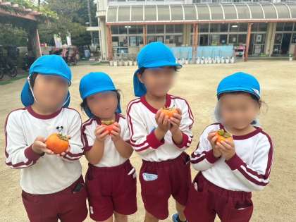 「匂いはするかな〜?」「この柿重たいよ!」「ちょっと硬いな〜」など子どもたちが気付いたことを話し合う姿に成長を感じました!