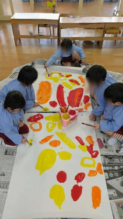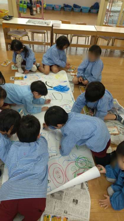 「大きい紙だね!」一人ではできないことも、友達と一緒ならできることがたくさんあり、友達と力を合わせて遊びを楽しむ子どもたちです。