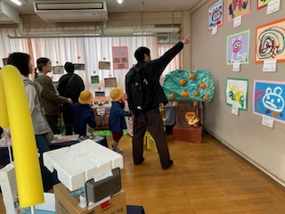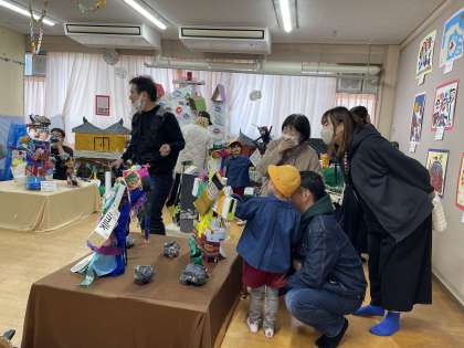 子どもたちは、保護者の方の手をひきながら、自分の作品や絵について、嬉しそうに話していました。自分のイメージをもって伸び伸びと表現しながら、一生懸命つくったり、かいたりした作品だからこそ、見てもらいたい気持ちも大きかったのでしょうね♪