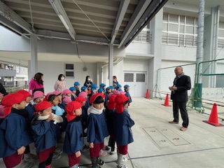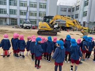 今、玉出小学校の運動場は工事中ですが、校長先生が玉出幼稚園の子どもたちのために凧あげをする場所の工事を1時間止めてくれるようにお願いしてくださいました。
