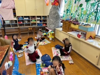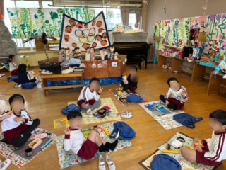 「みんなで船に乗って食べてるみたい!」「船見ながらみんなで食べるといつもと違って楽しいな!」「この船に乗って(絵本のお話に出てくる)たからじまに行きたくなるなー!」とこの時期だからこその特別感や楽しさがありいつもと違う昼食時間になったようです!