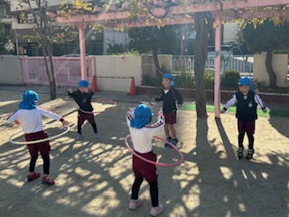フラフープや縄跳びにも毎日挑戦し、互いに遊びを披露し、「すごい!」「〇〇ちゃん、◯秒(フープ)回せてたで!」など声をかけ合う姿も見られ、日々いろいろな遊びに挑戦している青組の子どもたちです!