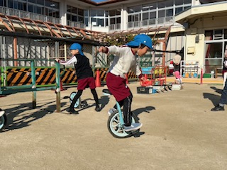 少しずつ一輪車にも慣れ、手を離して1人で漕いでみようとする子どもたちも増えてきました!
