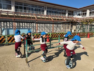 日に日に、一輪車に挑戦する子どもたちが増えてきた青組の子どもたち!