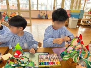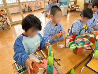 サンタが出てくる絵本を読んでいたこともあり、ツリーの飾り付けに折り紙でサンタのつくり方を知らせると「先生!小さいサンタもつくっていい?」「小さいサンタをいろんな色でつくったらかわいいんちゃう?」「モールで飾り付けもしたい!」と作品展でいろいろな素材に触れ、つくることを楽しんだ子どもたちからは、次々とアイデアが出てきていました!