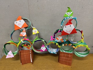 ガムテープやセロハンテープが無くなる度に出てくるテープ芯をたくさん集めていたこともあり、その芯を生かし、絵の具で色を塗ってそれぞれを組み合わせながら『ツリー』をつくりました!