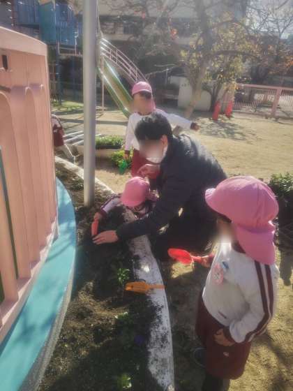 地域の方からいただいた、冬を越える寒さに強い花の苗を植えました。