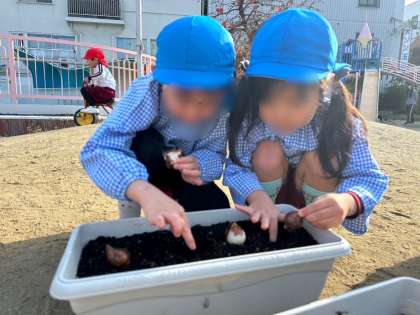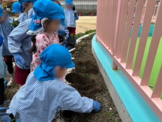 「幼稚園にいる間にお花が咲くの見れるかな〜?」「チューリップが咲く時には1年生になってる...?」など、子どもたちと話しながら花が咲く日のことを楽しみに植えている反面、幼稚園生活の終わりも近づいてきていることに寂しさを感じる瞬間でもありました。