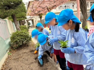 地域の方にいただいたたくさんの花の苗やチューリップの球根を園庭の花壇やプランターに植えました!何度も植え替えの経験がある子どもたちは、カップから苗を取り出し、間隔を開けながら苗や球根を植えることも上手になりました!