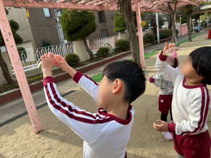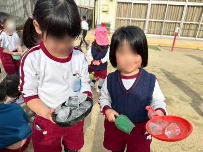 氷を見て「氷に模様が見える!」「綺麗やな〜!」と大事そうに持ちながら透かしてみたり、集めたりして友達と見せ合い楽しいひと時になりました!
