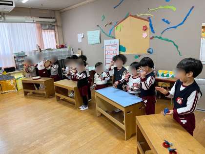 楽器遊びを楽しんでいる赤組の子どもたちの様子です。曲に合わせて繰り返し遊ぶ中でお気に入りの楽器ができたり、好きな遊びの中で指揮者やお客さんになって演奏会ごっこをしたりしながら遊んでいました。