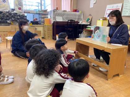 最後に紙芝居の復習を行い、いーちゃんと好き嫌いなく、お肉や野菜、魚をしっかり噛んで食べること、外で沢山遊ぶこと、うんちが出そうな時はがまんしないこと、この3つのお約束をしました。