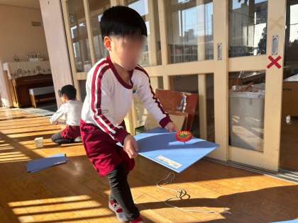 毎日、夢中になってコマやけん玉遊びに挑戦している子どもたち!どちらが長くコマを回せるか競い合ったり、手や板の上で回すことに挑戦したりと盛り上がっています!