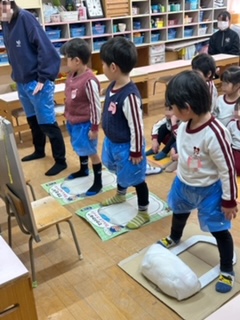 子どもたちとしゃがみ込み(カエル座り)の練習をしました。