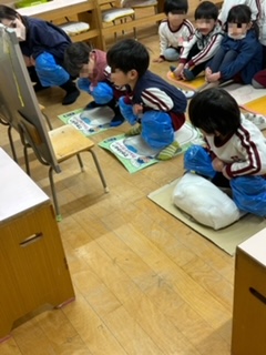 その後、手製の和式を用い、ポリ袋で作成したズボンを履いて脱ぐ動作・便器を跨ぐ動作などの確認を行いました。