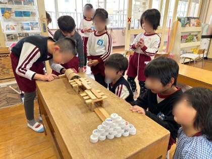 友達が遊んでいる姿を見て自然と周りに他で遊んでいた子どもたちも集まり、遊びが成功すると共に喜びを分かち合う姿も見られます!