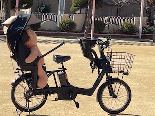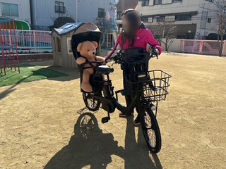 くまのあーちゃんに見本になってもらい、おうちの人の自転車の前や後ろに乗る時の約束を確認しました。