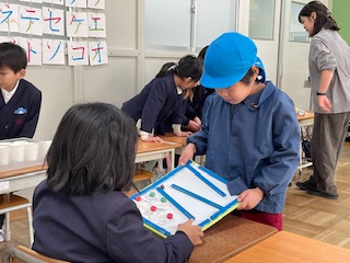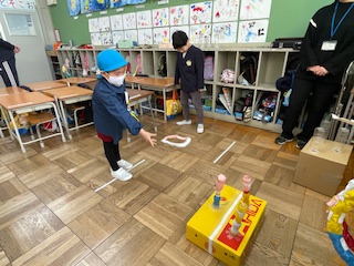 校内を探検後は、1年生(2クラス)が生活科の授業でつくった遊びを体験させてもらいました。輪投げ、的当て、新聞紙のボール投げ、ドングリゴマや迷路遊び、くじ引き、魚釣り、スプーンやお箸を使ったドングリすくいなど、盛り沢山な遊びを準備してくださいました!