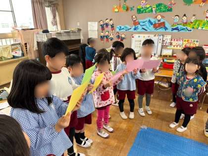 一人一枚受け取り「なんてかいてあるのかみんなで読んでみよう!」「ゆうぎしつにきてくださいってかいてる!」「ありがとう!」と嬉しそうにしていた子どもたち!