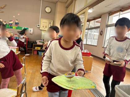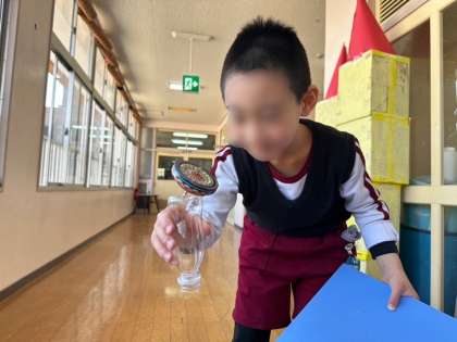 毎日、こま遊びを楽しみ、どんどん回し方が上手になっている子どもたち!「先生見てて!」と見てみると、回したこまを板に乗せ、さらに板に乗せたこまを小さなボトルの底の上に移動させる遊び方を披露していました!
