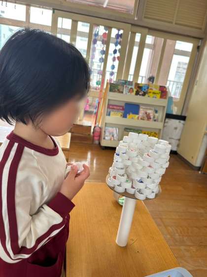 「うわー!ドキドキする!」と話しながらどんどんキャップを積み重ね40個近く乗せていました!バランスを考えながらそーっと乗せることに楽しさがあるようです!