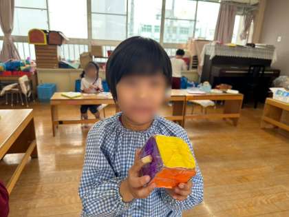 また別の幼児は、牛乳パックの底を6個使い張り合わせて、6色の色を塗ったり数字をかいたりしてサイコロをつくって遊んでいました!