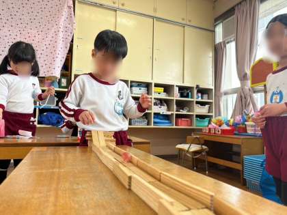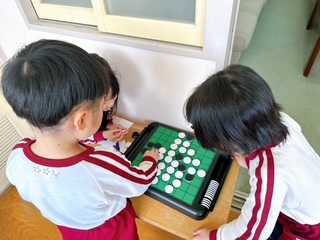 今日も園長先生や友達と一緒に廊下でけん玉遊びをしたり、オセロをしたり、保育室では積み木を組み合わせながらスーパーボールを転がすコースをつくって遊んだりと各々好きな遊びを楽しむ姿が見られました!