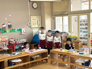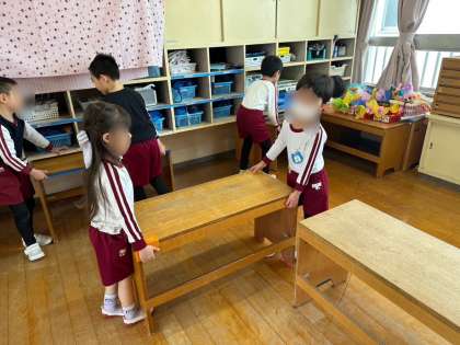 初めは、子どもたち同士で机を運ぶ姿に少しドキドキしながら見ていましたが、今では机の準備も友達と「せーの!」と声をかけ合い息もピッタリで安心して見ています!