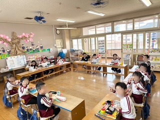最後の昼食もいつもと変わらず友達と一緒に食べる楽しい食事風景が広がっていました!3年間一緒にお弁当を食べて過ごしてきた子どもたちは、友達の好きな食べ物もよく知っています!