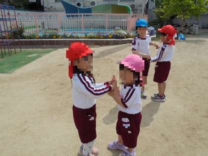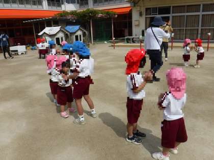 もも組は初めての集会でしたが、あお組・あか組にリードしてもらいながら、『だんごむしたいそう』や「だいすきっちゅ』のふれあい遊びを一緒に楽しみました。