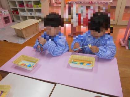 初めてハサミを使ったよ! 公開日 2025/05/19 更新日 2025/05/19 ☆お知らせ☆ もも組は、初めてハサミを使った活動をしました。 細長い紙を、1回でシャキン!と切って見せると、「うわっ!切れた!」「すご〜!」と感心した声が聞こえてきました。 ハサミを使う時の約束を説明すると、しっかり守りながら、みんな真剣な表情で切っていました。 切った紙片はビニール袋に入れて、風船のように膨らませると、高く投げ上げたり、友達と投げ合いっこをしたりして楽しんでいました。 いいね(0)