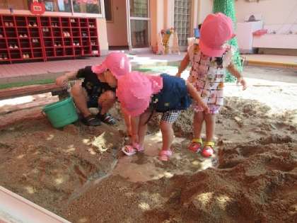 子どもたちは雨の日だって関係なく、水や泥の感触を楽しんでいますよ☆