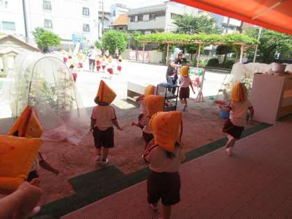 もも組(3歳児)は、初めて防災頭巾をかぶる経験をしましたが、見よう見まねで自分でかぶろうと意欲的に取り組んでいましたよ。