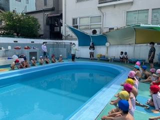 子どもたちは、プール遊びでの約束事の話にしっかりと耳を傾けていました。