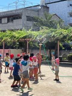 戸外遊びの最後のお楽しみ、『スプリンクラータイム!』です!片付けが終わるとみんなスプリンクラーの周りに集まってきました。