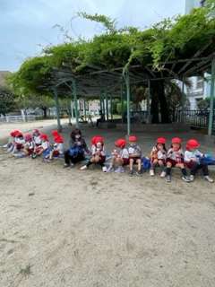 今日は、5歳児と3歳児がペアになって手をつなぎ、4歳児は、4歳児同士で手をつないで玉出南公園に散歩に出かけました。