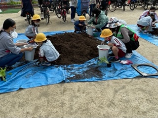 ブロッコリー、ミズナ、サンチュ、サニーレタスから一つ選び、子どもと保護者の方で苗を植えるふれあい栽培がありました。土を手で入れながら「フワフワ〜」と土の感触も楽しんでいました♪