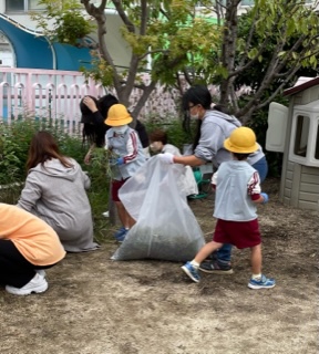 ふれあい栽培後は、園庭の側溝にたまっている土を出したり、草抜きをしたりして、園庭清掃をしていただきました。