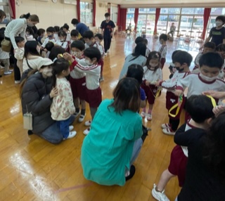 あか組(4歳児)、もも組(3歳児)のお兄さん、お姉さんが優しく遊びに誘ってくれたり、楽しく仲良し遊びをしたりして、はじめは、緊張していたお友達も少しずつ笑顔を見せてくれました。
