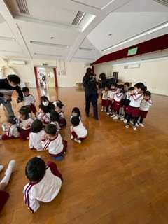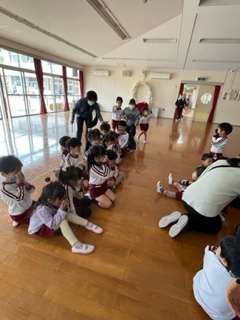 全園児、火災の恐ろしさを知るとともに、煙を吸わないようにハンカチで鼻や口を覆うこと、両手で押さえたら転んだ時に手をつくことができないので片手で覆うことなどを知りました。