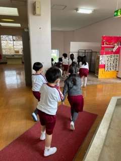 赤組(4歳児)は、放送をよく聞いて静かに避難することができました!