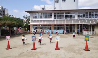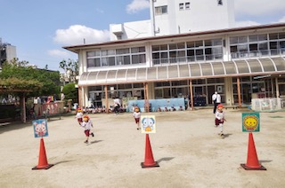 もも組(3歳児)のかけっこの時は、あお組(5歳児)が一緒に並んでくれたりゴールで待っていてくれたりしました。
